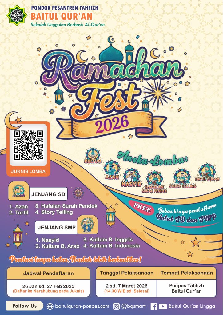 Dalam rangka menyemarakkan bulan suci Ramadhan sekaligus menumbuhkan semangat berprestasi generasi Qur’ani, Pondok Pesantren Tahfizh Baitul Qur’an akan menggelar Ramadhan Fest 2026, sebuah ajang lomba islami yang diperuntukkan bagi peserta jenjang Sekolah Dasar (SD) dan Sekolah Menengah Pertama (SMP).